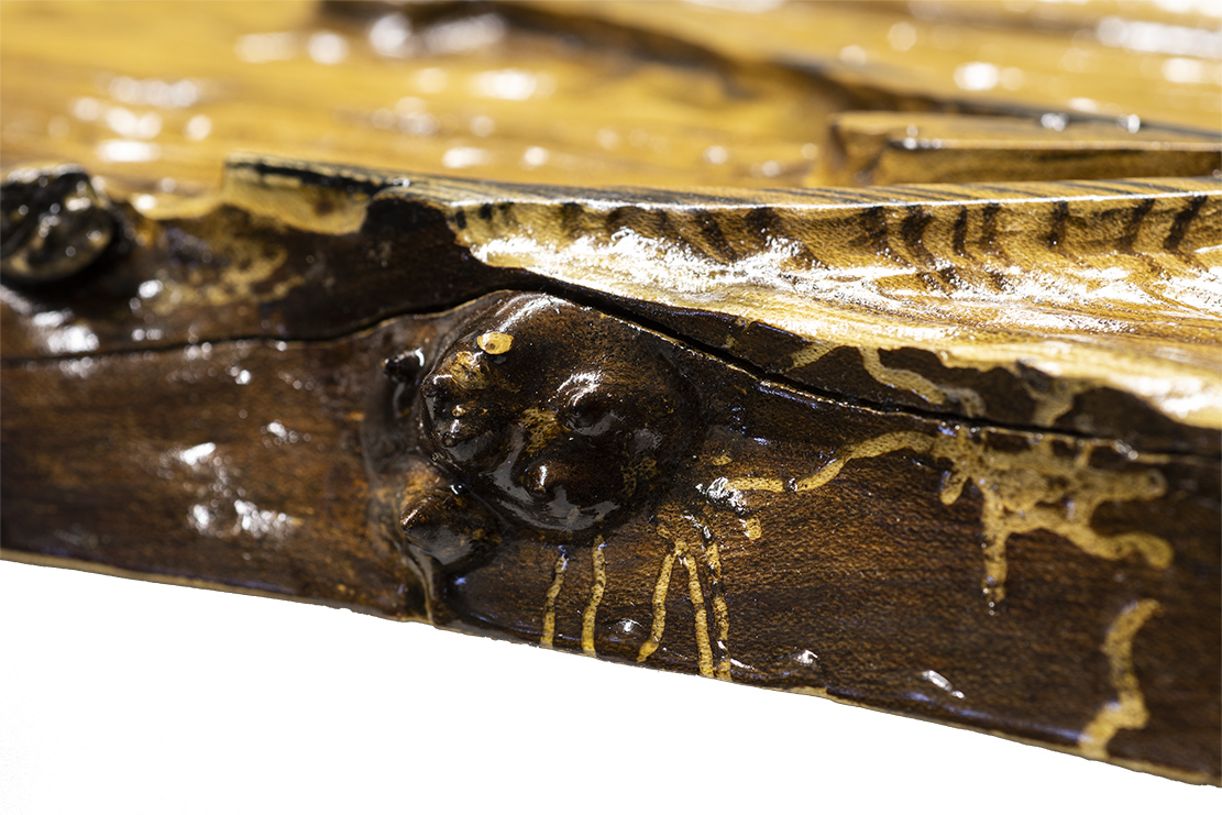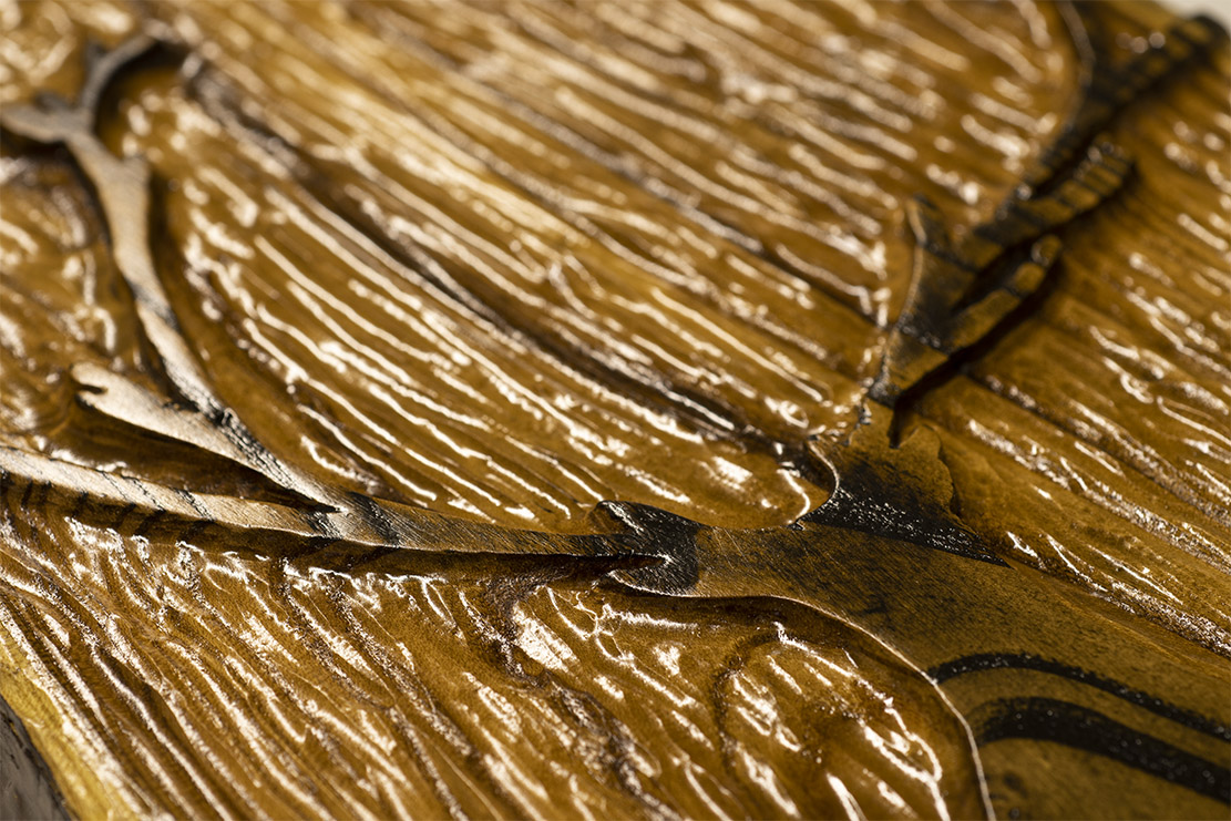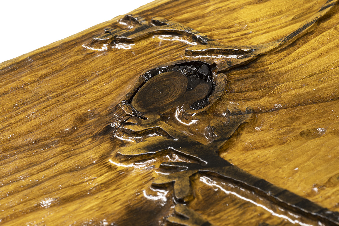 “Enchanted Deer” poses majestically on a beautiful slab of live-edge Russian Olive wood. Set apart from the mountains and the lowering sun in the sky, the texture moves from forested trees, to textured mountainsides, to smooth skies. Stained with Ebony, Dark Walnut, and Red Chestnut, the cresting waves of grain stand out from each other and you can almost feel the royalty coming from this enchanted scene.
