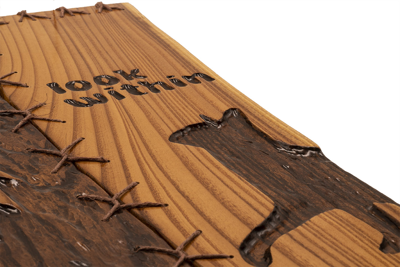 I’ve seen many different artists represent this same scenario with a mirror. The domestic cat is looking into a mirror and the reflection is sees is a fierce and free lion. I was obviously inspired by them, but the one thing I didn’t like was that it represented the physical side of the belief. “Look Within” represents the mental side. There is no mirror or body of water. The board piece of art is literally stitched back together after being broken in half. That’s the representation that matters most. How we heal ourselves after trauma is, to many, an insurmountable feat. However, I believe that anyone can mend themselves and grow into who they see themselves as if they follow their instincts and simply “Look Within”.