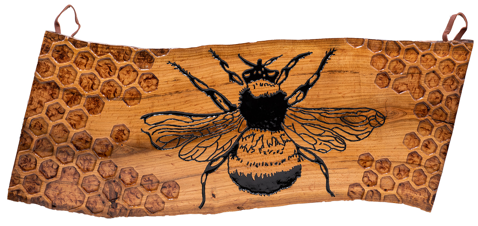 Carved with care into piece of my rare, heritage, apricot wood! Mr. Bumble is inspired by the beauty of life and family. Accompanied with an intricate honeycomb, you get the sense of belonging from Mr. Bumble as he travels home to his family with pollen stuck to his legs!